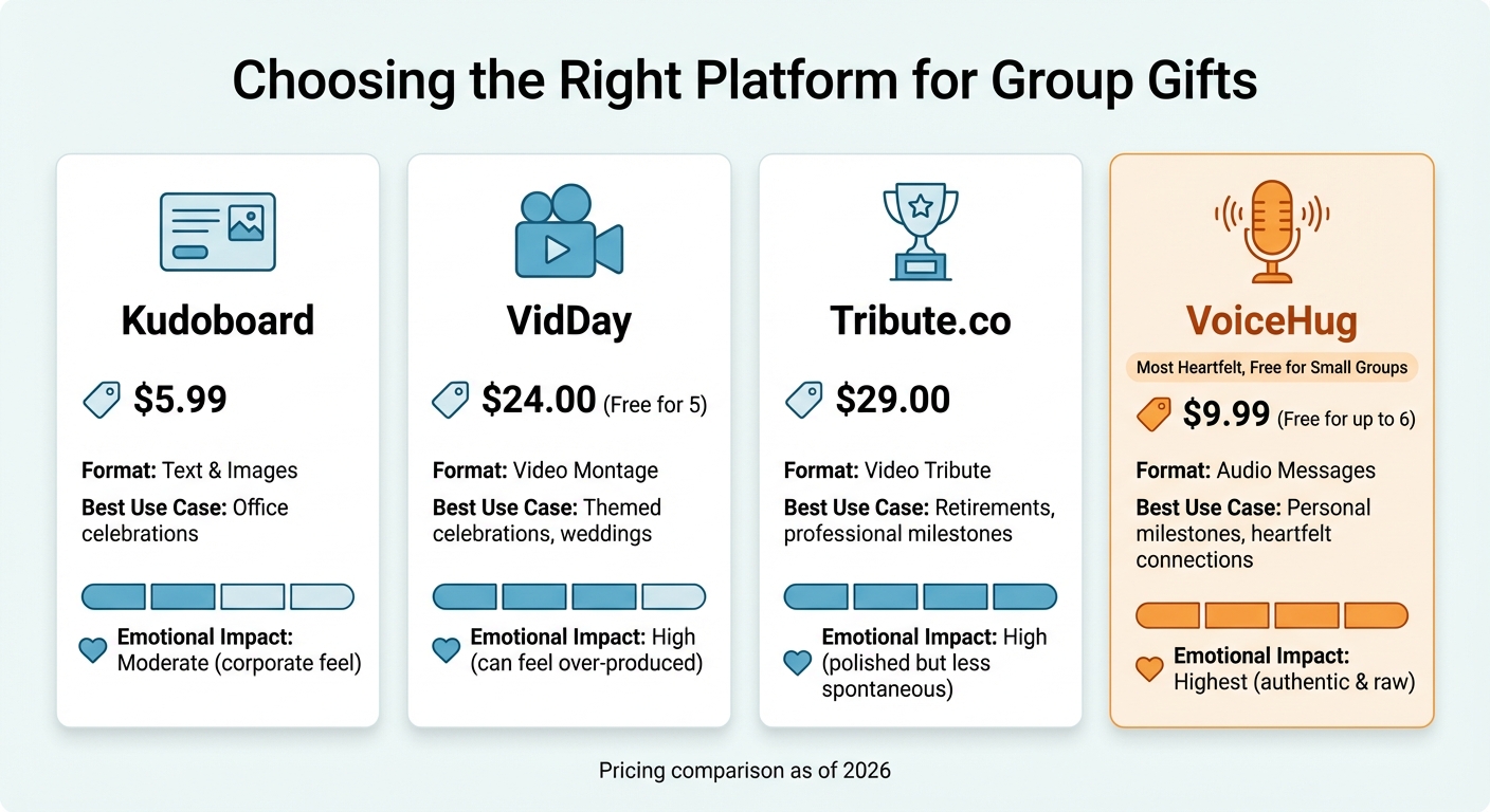 Take VoiceHug as an example. Their $9.99 plan for groups over six offers a more affordable option compared to video platforms like VidDay ($24–$60) and Tribute ($29) [8]. And with its focus on audio, it captures raw, heartfelt emotions without the added pressure of being on camera. This makes the experience feel more like an intimate conversation than a polished performance. It’s a simple yet powerful approach to emotional gifting that’s both budget-friendly and meaningful.